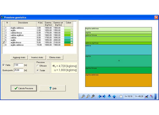 Permette di calcolare la pressione geostatica totale ed efficace a qualsiasi profondità in terreni stratificati con e senza falda.