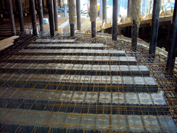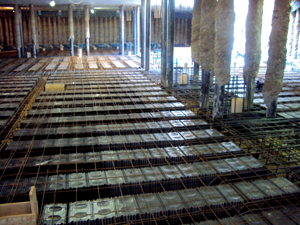 Grazie ai piedini conici elevatori, infatti, immergendo i casseri U-Bahn Beton® nel getto di calcestruzzo si ottengono travi in spessore, parallele fra loro, chiuse inferiormente e superiormente da una lastra piana eseguita in sequenza e in un’unica gettata; il tutto con un notevole risparmio di calcestruzzo e acciaio, nonchè considerevoli vantaggi in termini di rischio incendio rispetto ad alleggerimenti in polistilene espanso.
