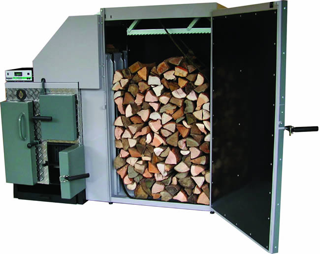 L’impianto di rifornimento automatico viene riempito fino a 650 litri di legna. In caso di richiesta di calore il legno viene sollevato da 2 catene fino a cadere nella conca di consegna. La conca di consegna fa seguire il legno nella camera di combustione.